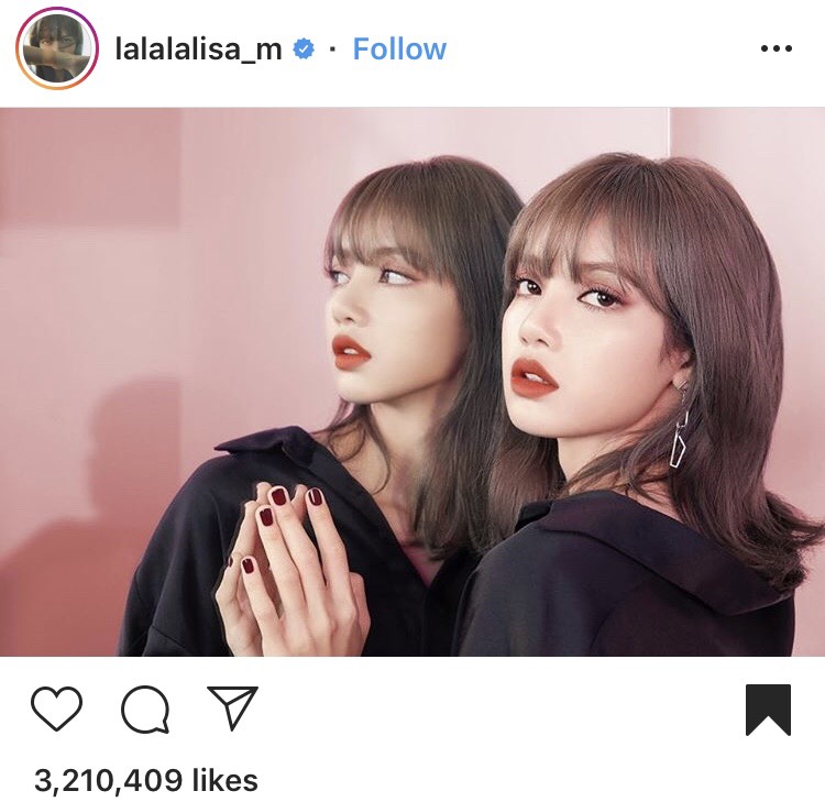 Instagram influencer Lisa styles her fringe front bangs with a shoulder length hair cut and matte apricot red lip.